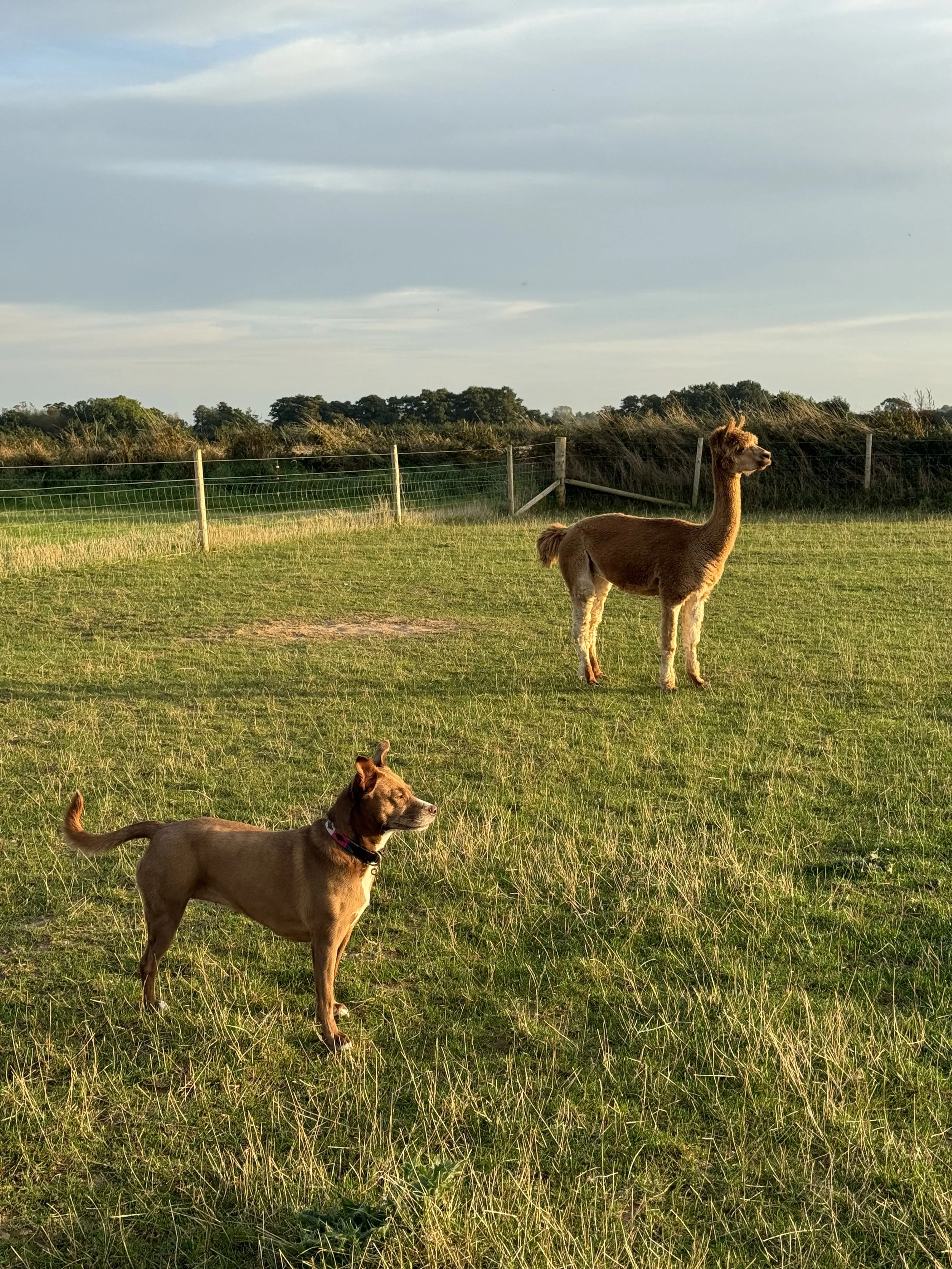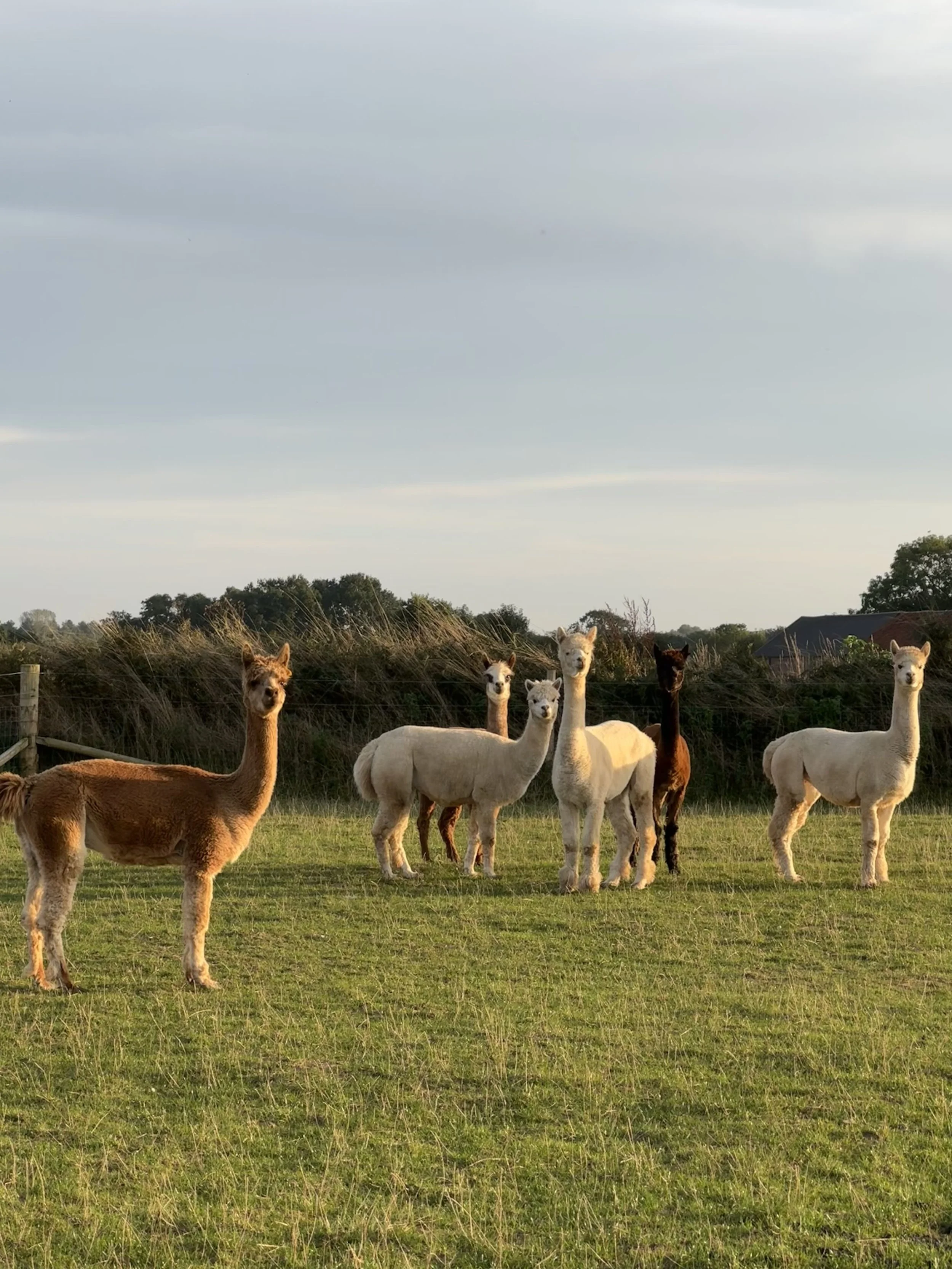 I spent 2 weeks in Norfolk house sitting with 6 alpacas, 8 chickens, and Chanel the Chihuahua and Violet and Ginger the Pomchis. And of course, Harley, my dog is with me. Harley is obsessed with the Alpacas. She gets so excited to go out to the field with me to feed them.