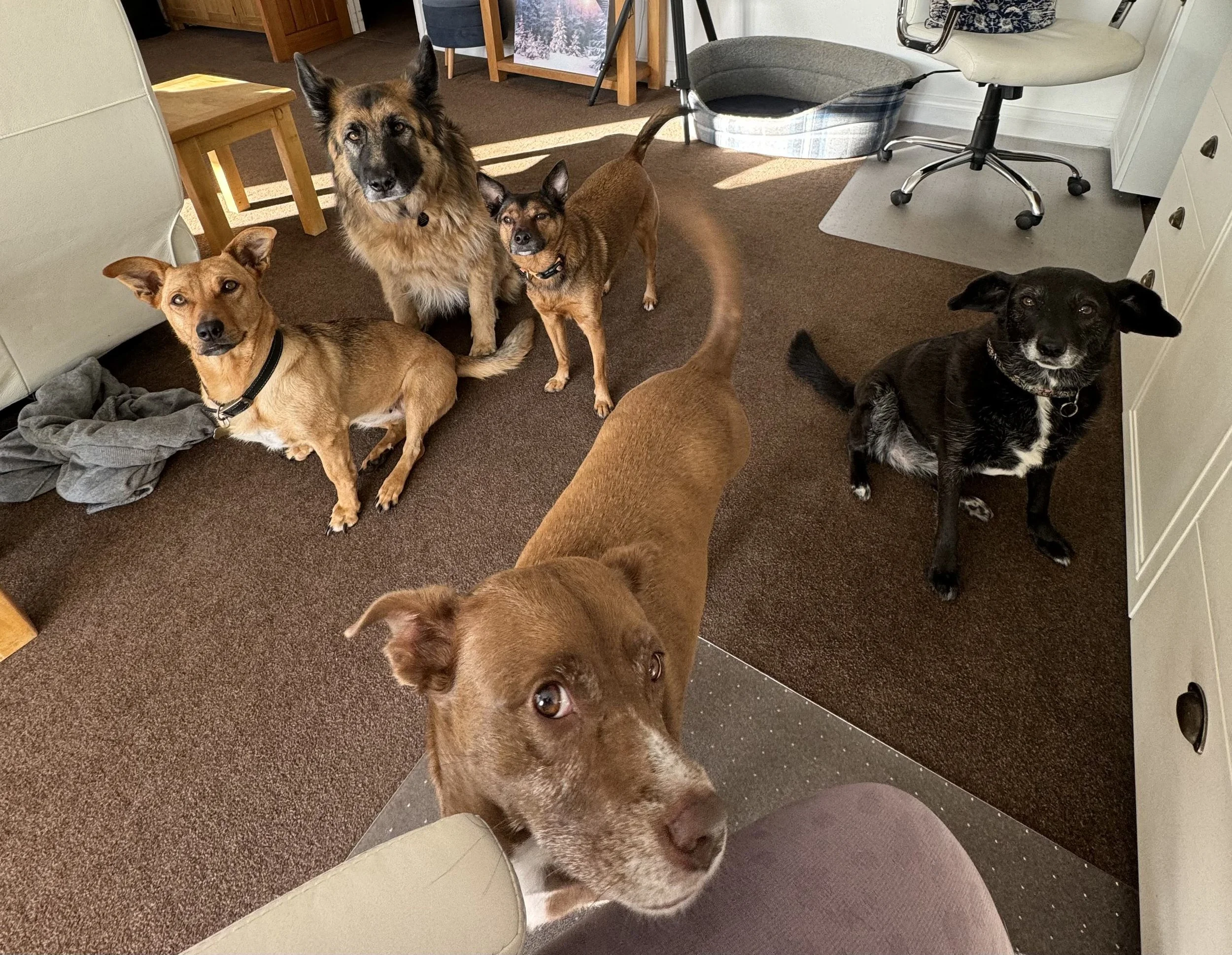 The whole gang. Toffee - the Romanian street dog rescue, Petra- the German Shepherd, Elsie - the terrier mix, Coco - another Romanian street dog rescue, and Harley at the front.